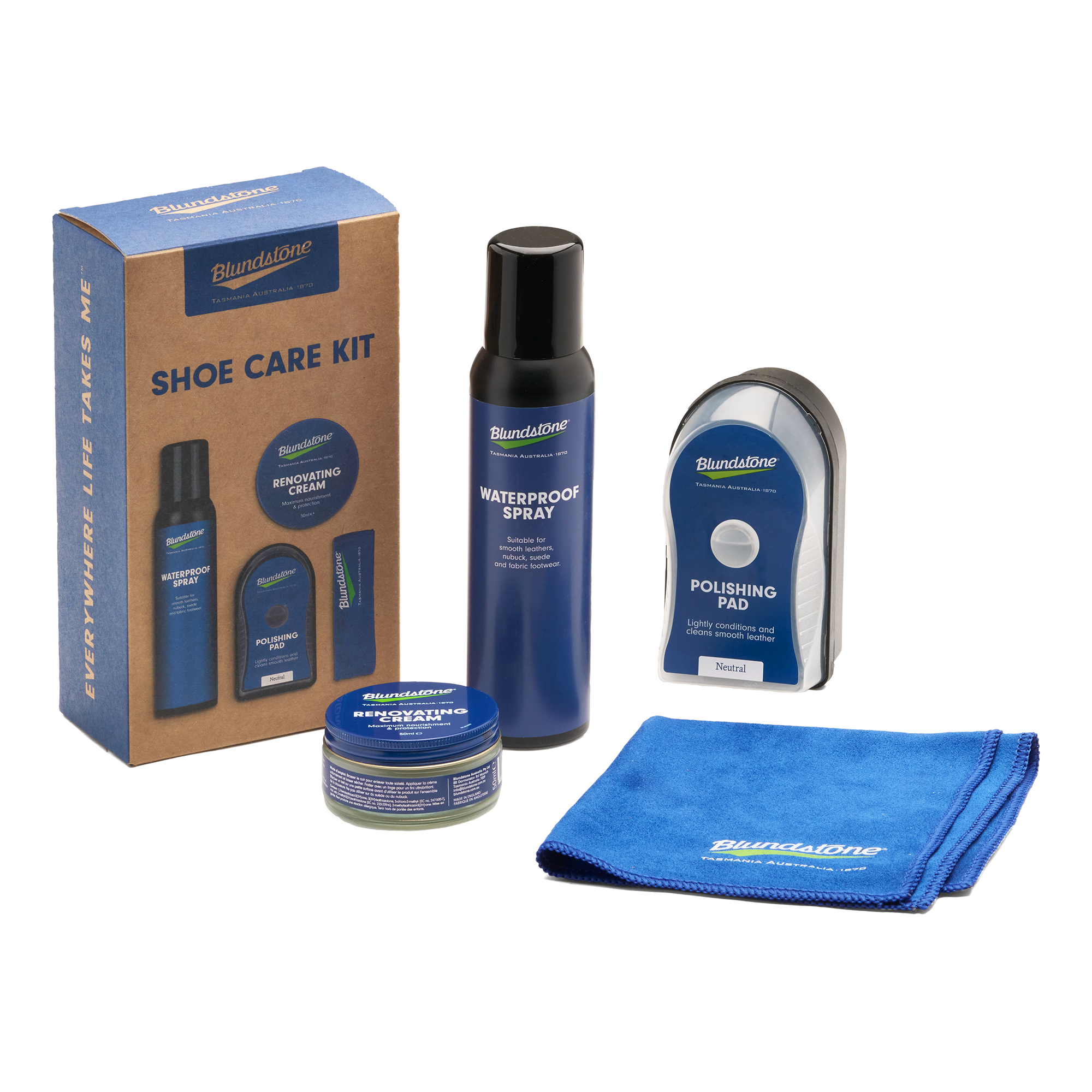 For ultimate boot care. Contains a range of Blundstone boot care products: Rustic renovating cream (50ml) designed to help maintain the color and finish of your boots. Blundstone branded buffing cloth for cream application. Waterproofing spray (125ml) formulated to protect from water and stains. Polishing pad pre-saturated sponge that rejuvenates the leather of your boots.