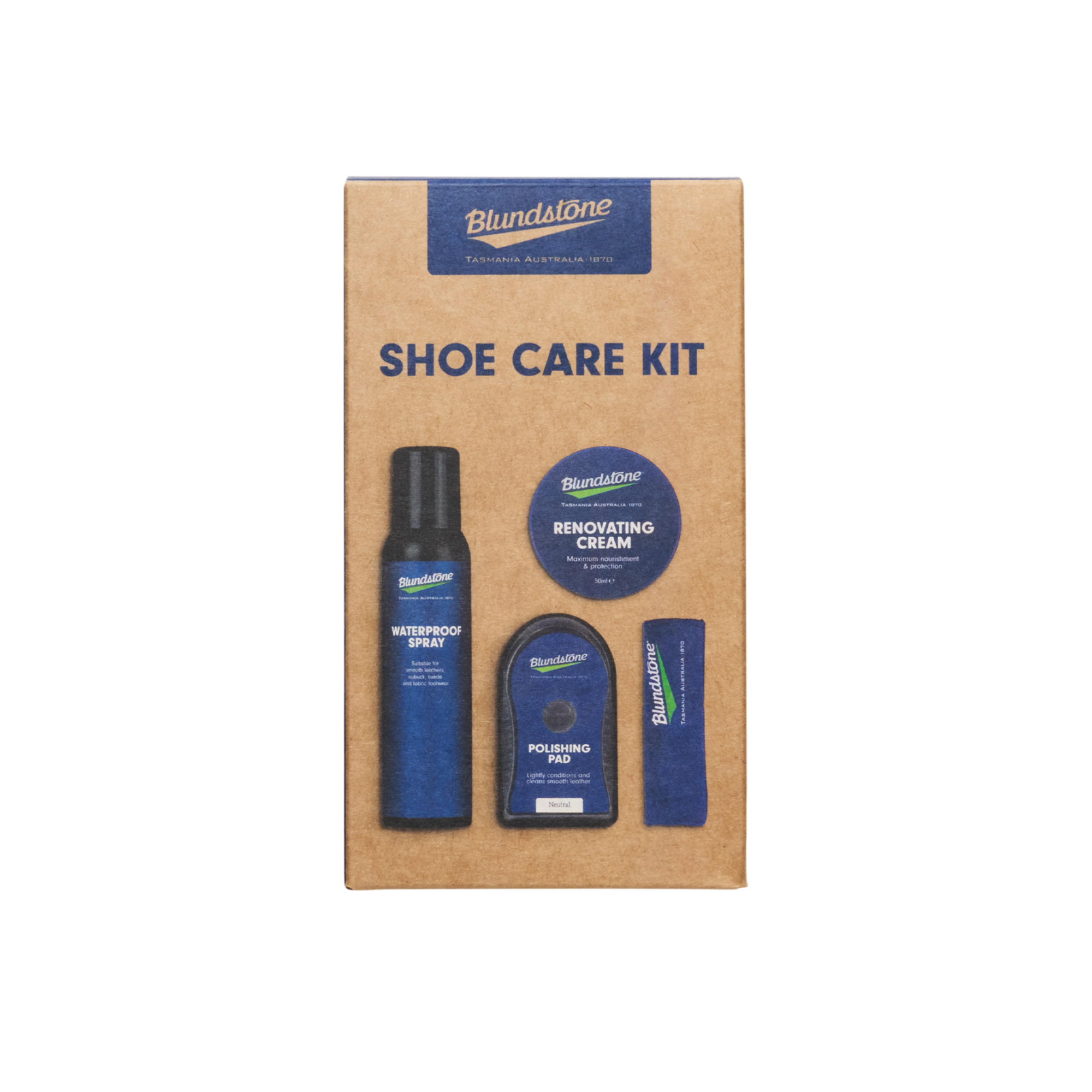 For ultimate boot care. Contains a range of Blundstone boot care products: Black renovating cream (50ml) designed to help maintain the color and finish of your boots Blundstone branded buffing cloth for cream application Waterproofing spray (125ml) formulated to protect from water and stains Polishing pad pre-saturated sponge that rejuvenates the leather of your boots.